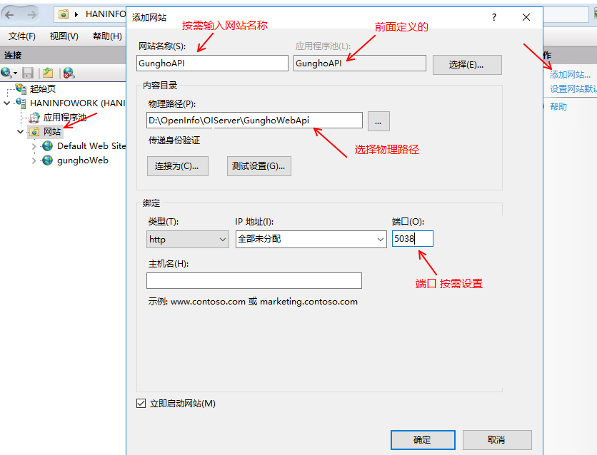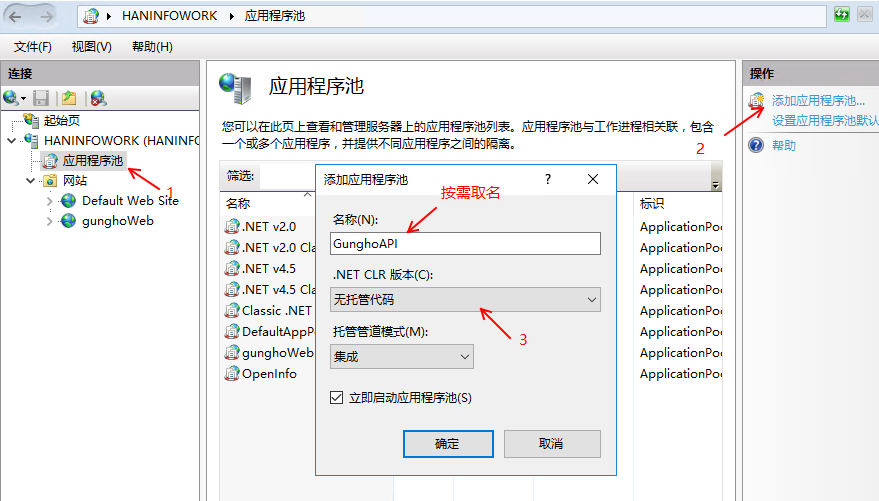 输入应用程序池名称,选择“.NET CLR 版本”为“无托管代码”。